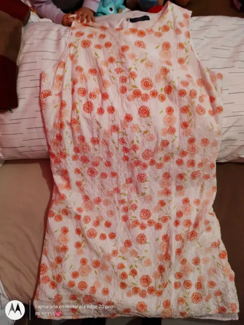 Vestido corto, sin manga, escote redondo, color blanco con flores naranjas, cierre en la espalda
