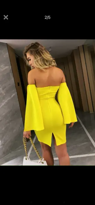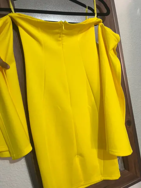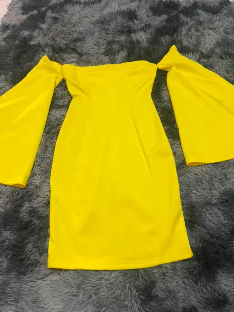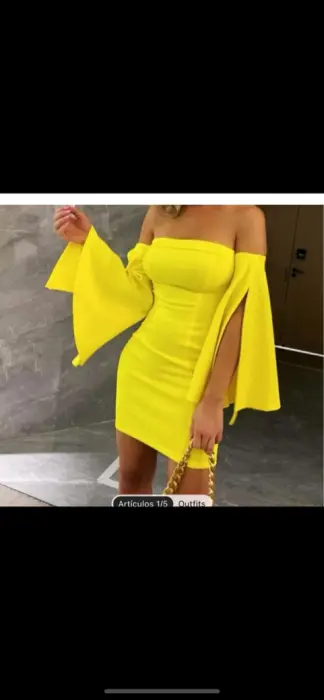 Vestido Xs de manga amarillo elegante tela estira. Talla Xs vestido amarillo pollito de mangas abiertas Bonito escote Entalla bien la tela estira