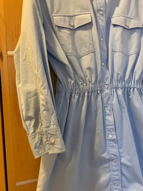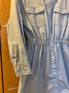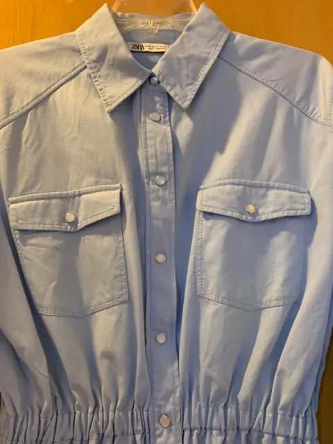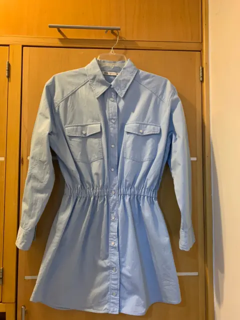 Hermoso vestido marca ZARA con botines al frente y elástico en la parte de la cintura, no tiene ningún detalle, manga larga, color azul mezclilla, súper bonito y combinable !!!