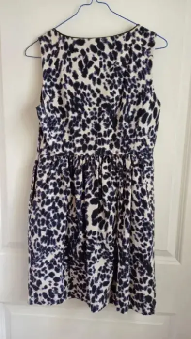 Vestido estampado animal print, azul, negro y blanco, talla 28, bolsas laterales, usado y en excelente estado
