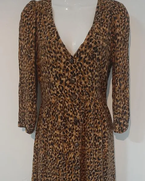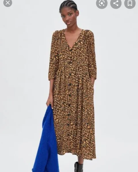 Vestido largo con estampado animal print (leopardo) de la marca ZARA trf , talla S pero le puede quedst hasta a un M. Usado con 3 desperfectos en la prenda por el mismo uso que no son visibles, solo 1.-En la parte del pecho se cosio por que es abierto y se nota el arreglo y como se jalo la tela.-En un extremo tiene un poco descocido pero tiene arreglo.-Y un hoyito que tambien tiene arreglo