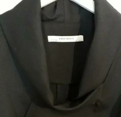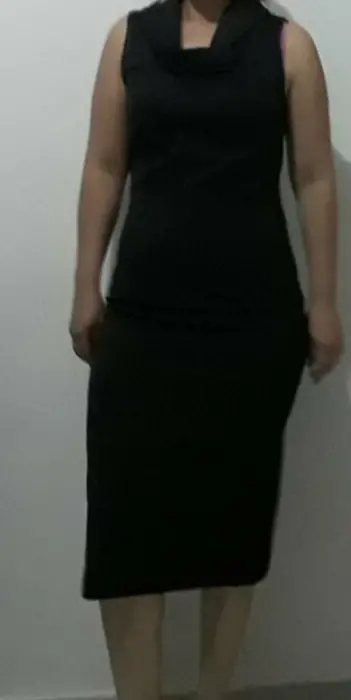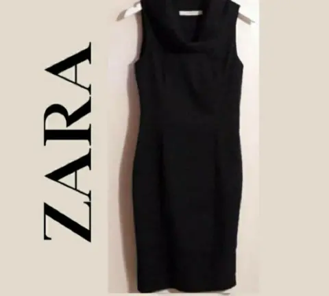 Vestido Zara Basic, tipo lápiz, color negro con zipper a un costado, abertura en la parte de atrás, cuello holgado. Talla 26 (S). Medidas: largo total desde los hombros 102 cm., busto 90, cintura 76 cm., cadera 86 cm. La tela no estira.
