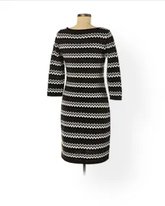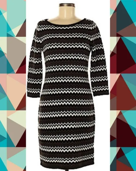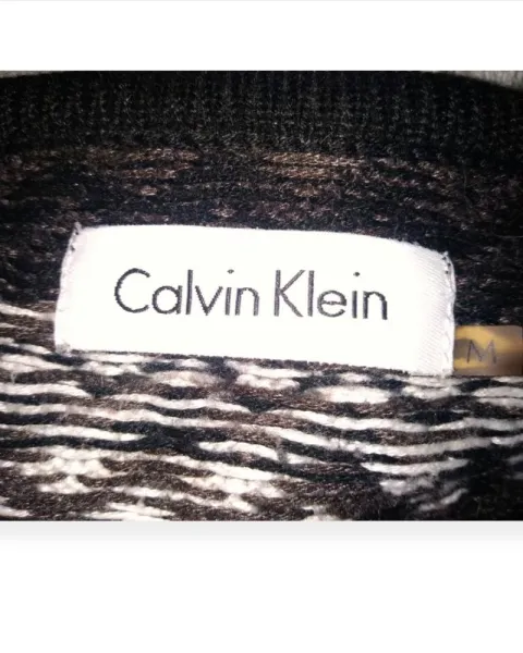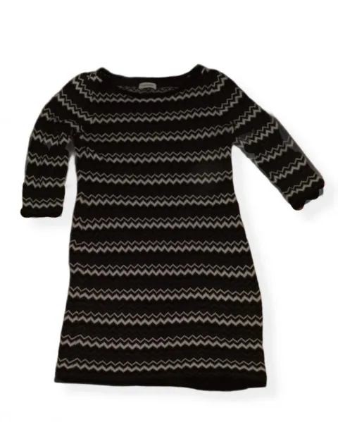 Vestido Zig zag Calvin Klein. Hermoso Vestido Talla M, algunos detalles que se muestran en foto. 90% acrilico 10% poliester. Manga 3/4. Ideal para esta epoca del año, calientito. Podemos negociar el precio, estoy a tus ordenes.Medidas: 92 cm de largo, 38 cm de cintura 49 cm de manga, queda muy bien también para talla L