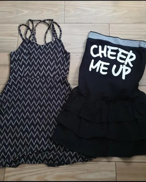 Dos vestidos cortos talla chicaUno es aeropostale de tirantes y estampado de grecas Es tipo corsé tiene varilla lateral por lo que no se mueve y da más forma y falta corte AEl otro es strapless sasha super sport con falda olan super femenino perfecto para un date casual