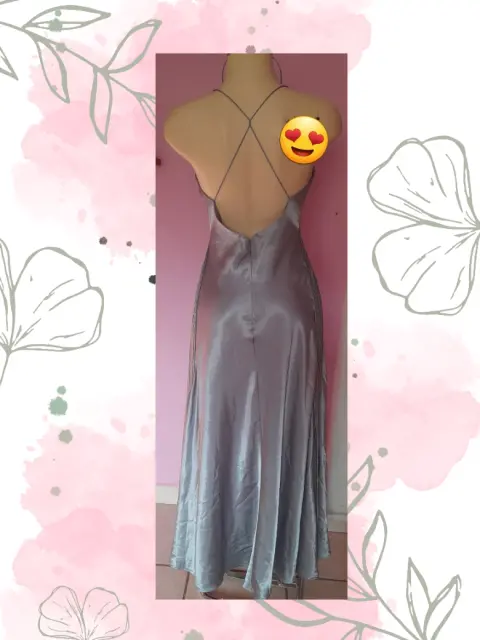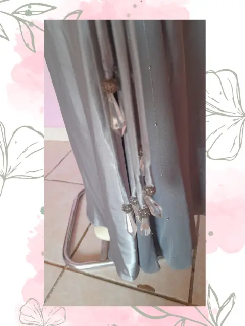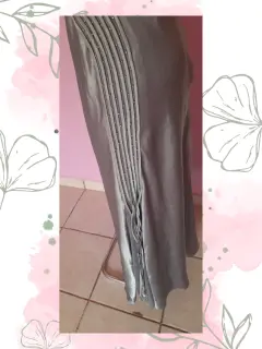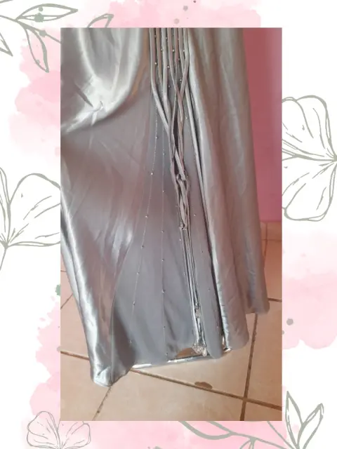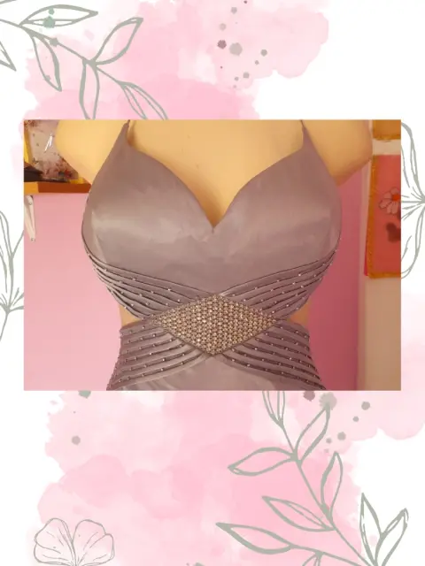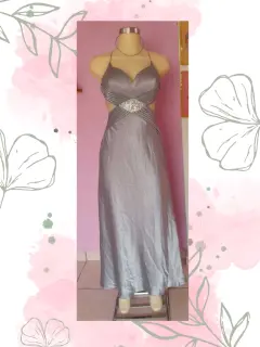Vestido de Noche con transparencias a los costados, en el frente tiene pedreria y a los lados de la falda tiene pedreria y detalles con liston tal y como se ve en la foto. El largo es hasta el tobillo.Talla: LColor: PlateadoMarca: Obsession