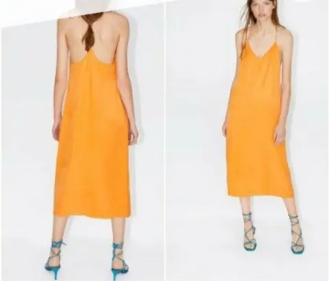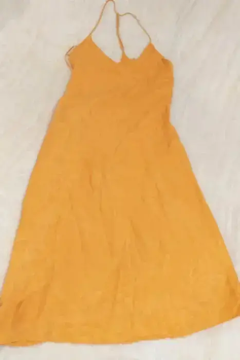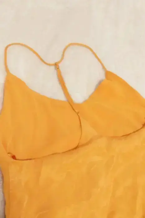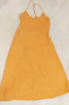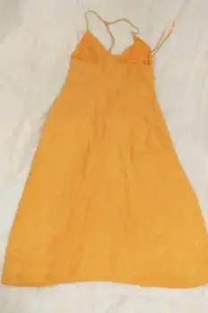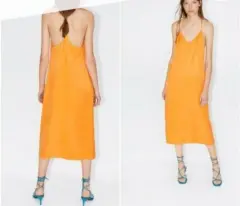 ZARA VESTIDO AMARILLO TIRANTE ESPALDA S, escote en V, satinado, ligero con forro.Medidas:De axila a axila 41cmLargo 108