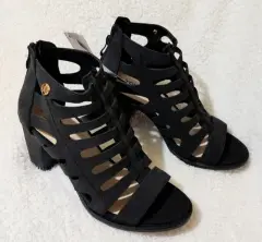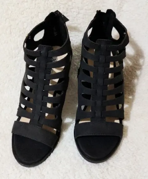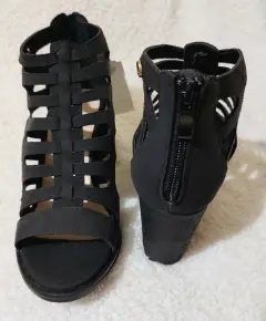 Hermosa zapatilla color Negra de material resistente al agua, diseño elegante perforado con cierre atrás, estilo tiras romanas, suela antiderrapante, altura tacón de 8cm. México Número #25cm. Pregúntame o visita mi closet para más modelos y numeración. En tu primer compra dentro de la app se te descuenta -$ usa mi código Promocional Copia y pega: lucyrmxXqQJ9