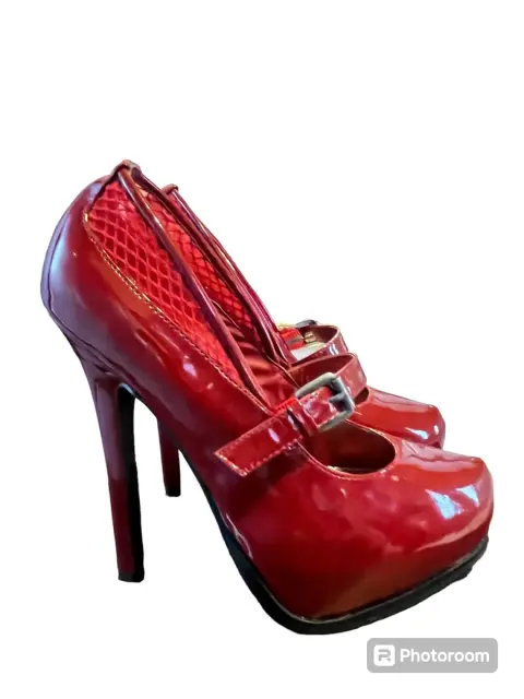 Hermosos zapatos de plataforma, en charol, color rojo, con cinta sobre empeine, tacón de 12.5cms de altura, nuevos, sin estrenar, en caja, marca bebe, talla 6 US