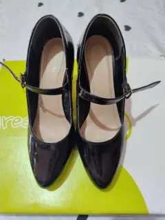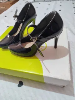 Zapatillas de charol, talla 25, negras, tacón del 10, con cinta de hebilla, en buen estado