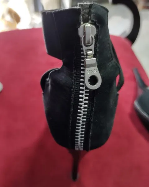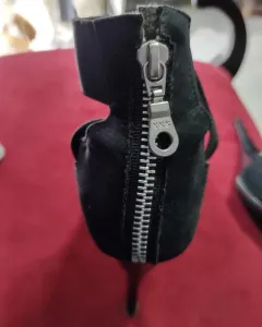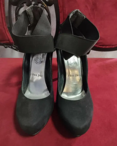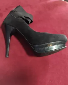 Bonitas zapatillas de gamuza. Hermosas zapatillas color negro, con plataforma y tacon delgado. En perfecto estado. Con cierre en la parte trasera y cintas elásticas. Tacón de 12 cm y plataforma 2cm talla 24 cm (4). Corte textil, forro sintético y suela sintética. La plataforma y tacon es colo gris con negro, tal vez no se aprecia bien en la fotoMarca Abusiva