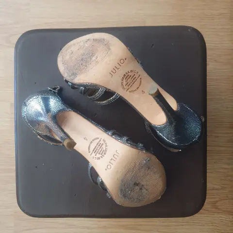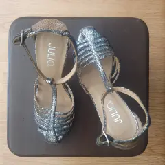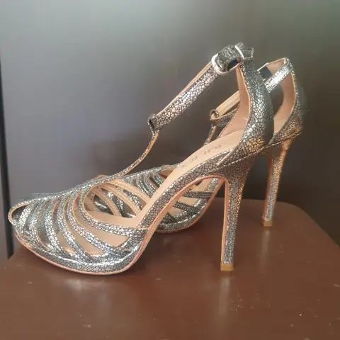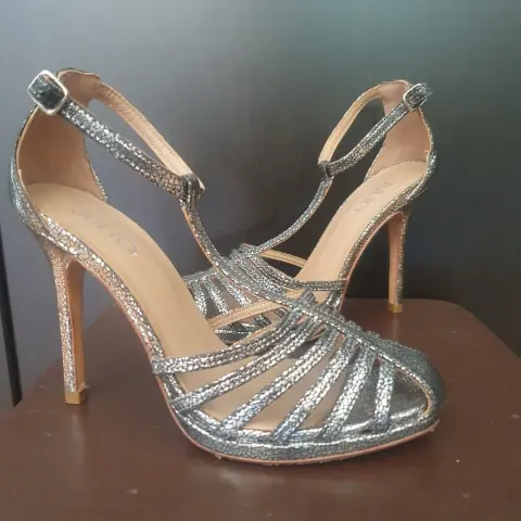 Elegantes, plateados para una fiesta increíble. Zapatilla correasPlatatacón 12 cms1 vez usadosMarca Julio