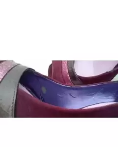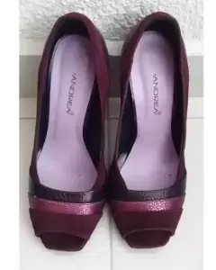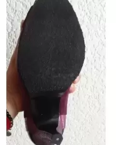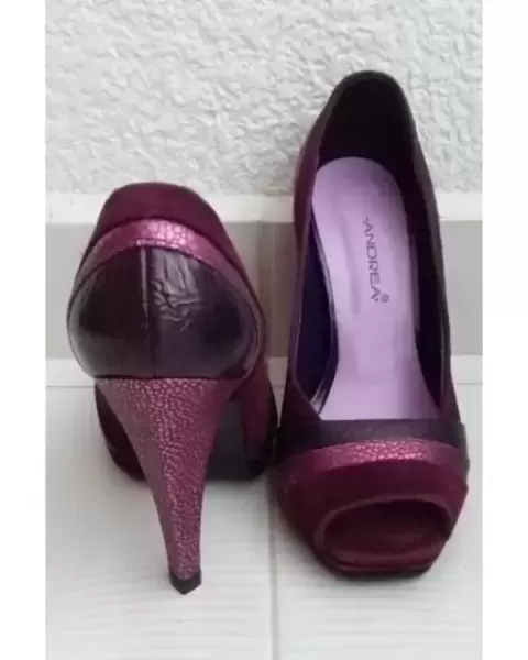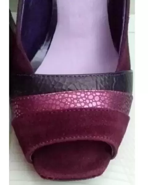 Bonitos tacones color uva, de boca de pescado con diferentes texturas son de gamuza y su tacón es en forma de pentágono. Están nuevos y fueron modificados se les quito la plataforma, tiene por dentro el detalle de que por el tiempo de no uso se pelo el forro por dentro se alcanza a ver en la última foto.