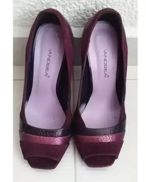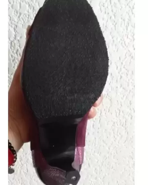 Estiletos uva 🍇. Bonitos tacones color uva, de boca de pescado con diferentes texturas son de gamuza y su tacón es en forma de pentágono. Están nuevos y fueron modificados se les quito la plataforma, tiene por dentro el detalle de que por el tiempo de no uso se pelo el forro por dentro se alcanza a ver en la última foto.