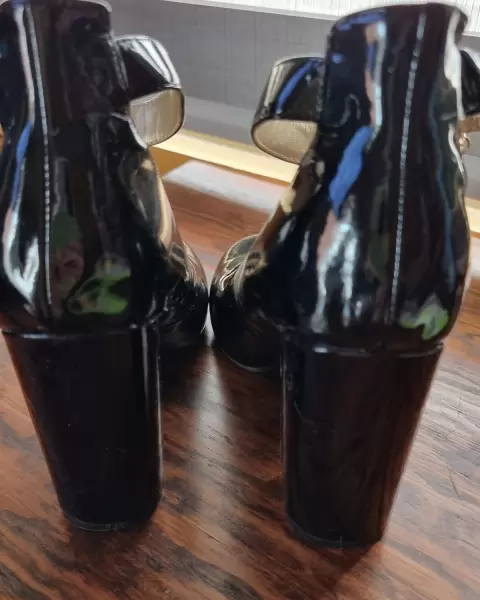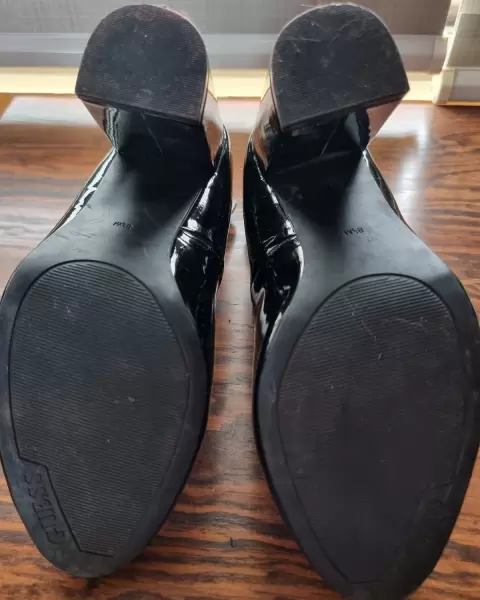 Preciosas zapatillas de charol marca Guess. El tacón es ancho, tipo Marquis, en excelente condición. La pulsera también es ancha, con el emblema de la marca en excelentes condiciones. El interior del zapato derecho, tiene una marca causada por el tiempo de guardadoEl forro del calzado es de piel y de piel sintética en color dorado.Las condiciones del calzado son excelentes, pero se han lastimado un poco por almacenamiento prolongado.