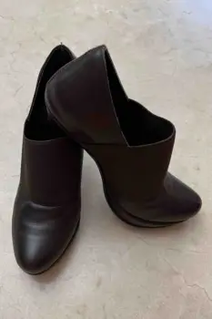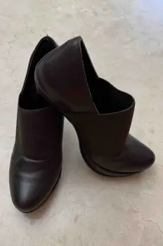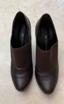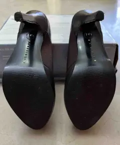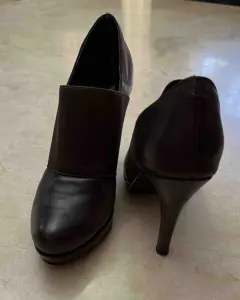 Zapatillas españolas cerradas café obscuro de piel y diseño elástico en empeine. Número mexicano 4.5, tacón 10.5 cm de alto. Ideal para graduaciones y eventos en tiempo de lluvia.