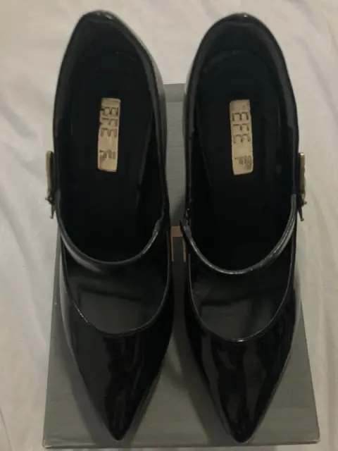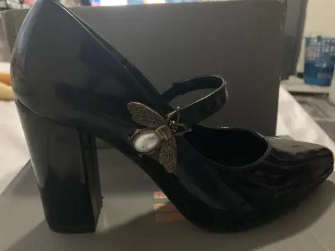 Hermosos. Zapatilla de tacón cuadrado de punta de charol con hermoso detalle en el tobillo