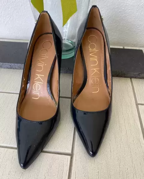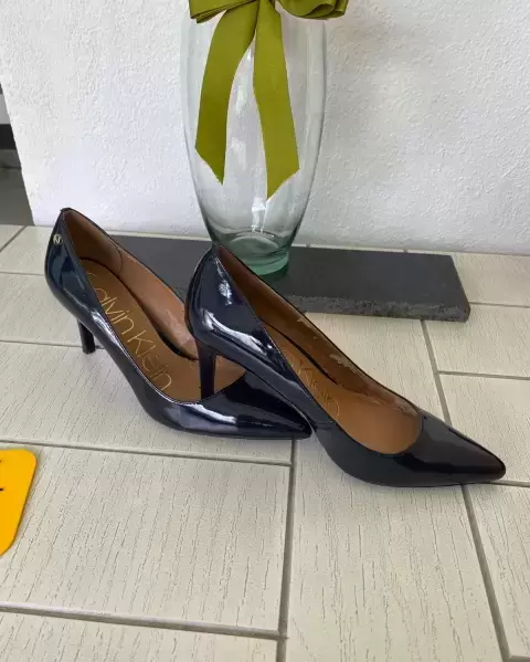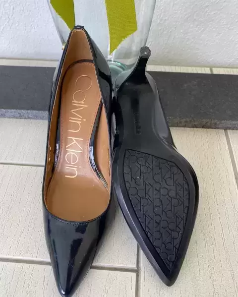 Lindas zapatillas Calvin Klein. Lindas zapatillas son color azul marino casi negras, están completamente nuevas tiene un pequeñito rasguño en el tacón casi pegado a la tapa y por estar guardadas se descarapelaron un poco por dentro .Anímate son muy lindas 🤩