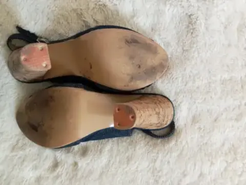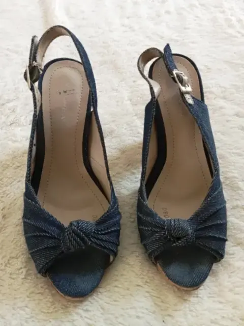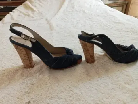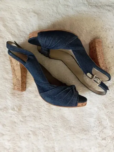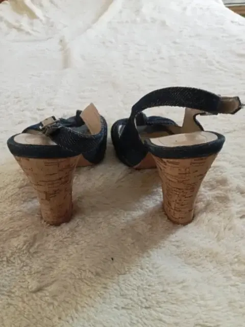 Peep Toes de tacón de corcho de 10 cm.Mezclilla, broche de piel con mezclilla, talla 4.5.