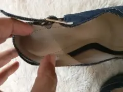 Peep Toes mezclilla Andrea. Peep Toes de tacón de corcho de 10 cm.Mezclilla, broche de piel con mezclilla, talla 4.5.
