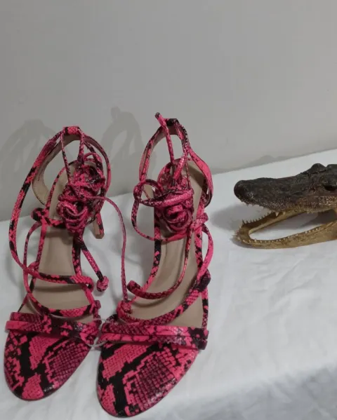 Sandalia Con estampado de serpierte color rosa con negro con correas de tobillo #8.5. Suela de piel echo en brasil