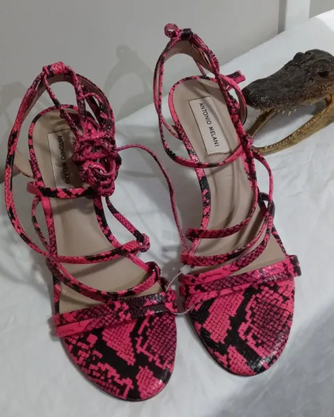 Sandalia ANTONIO MELANI. Sandalia Con estampado de serpierte color rosa con negro con correas de tobillo #8.5. Suela de piel echo en brasil