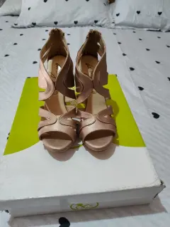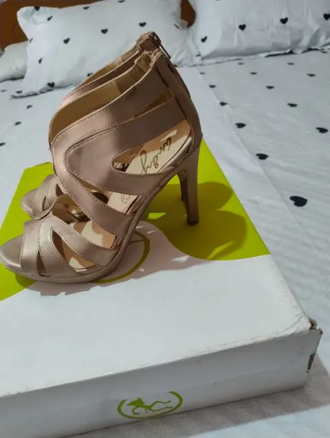 Sandalia de tacón tipo botín con cierre en la parte trasera, color oro, casi nuevos, solo los use en dos ocasiones