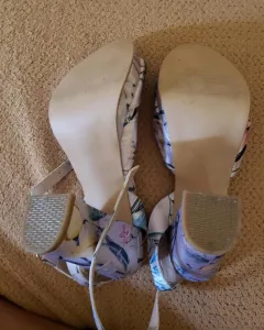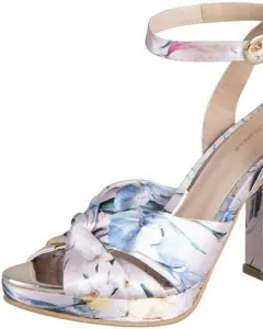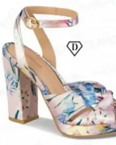 Sandalias con tacón de 12 cm y plataforma de adelante de 2 cm, se abrochan al tobillo. Color rosa con flores