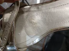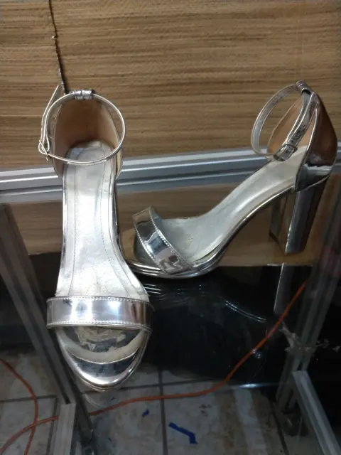Sandalia de tacón plateada. Sandalia de tacón plateadas 4.5 efecto espejo tacón redondo en excelente estado