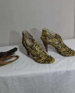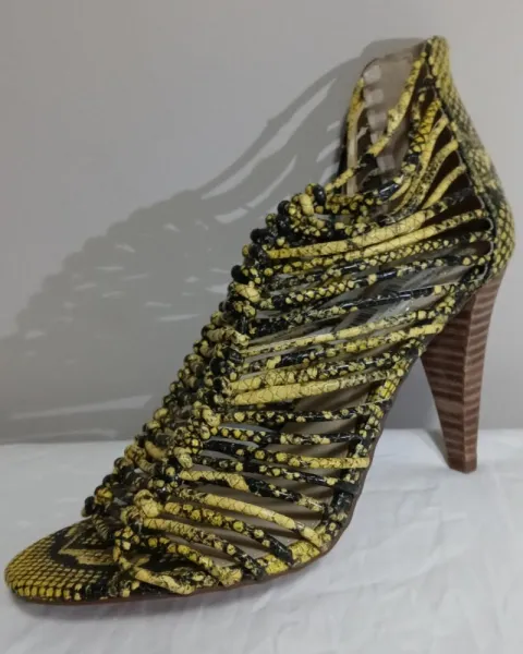 Sandalia Vince Camuto. Tacon Vince Camuto con estampado de serpiente amarrillo con negro preciosas