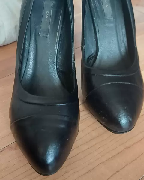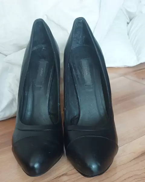 Stiletos, tacón delgado,, pkataforma de piel color negro.Talla 4.5