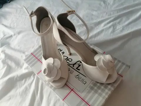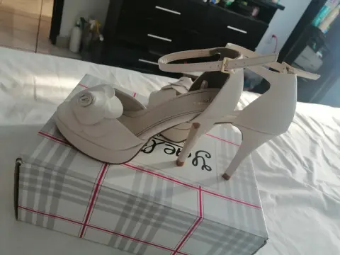 Tacones lindos en color hueso, increíbles para una ocasión importante, tiene una flor en la parte de enfrente, la talla es 23