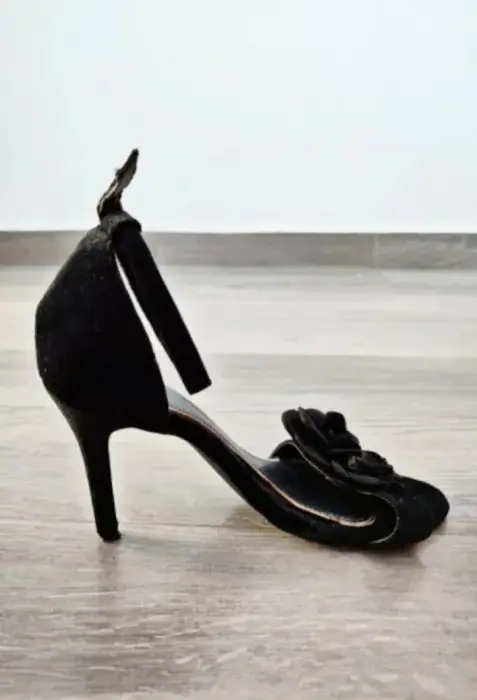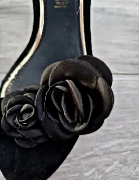 Tacones abiertos color negro. Tacones súper elegantes con rosas de tela 👠Talla #6-Puestos se ven súper bien-El tacón es súper delgadito yo calculo que de lo alto es un #8-Hacen que el pie se vea muy estilizado