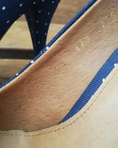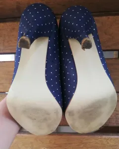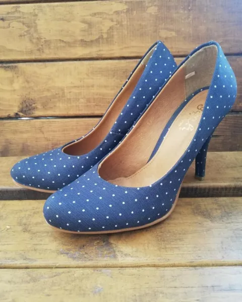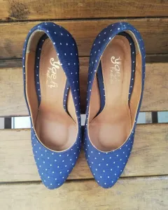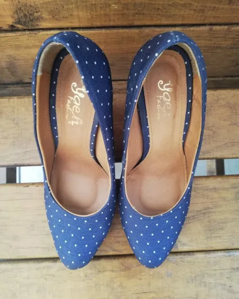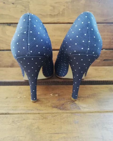 Zapatos color azul con puntitos blancos, son del número 24. El tacón mide 10 cm de alto.