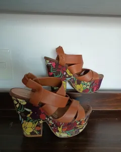Tacones cafés con plataforma floreada. El tacon mide 12 cmSon de plataforma, son comodosSon de resorte , ubicado en la parte de atras (en la imagen se ve)El diseño de arriba es de piel sinteticaTalla 4 MX
