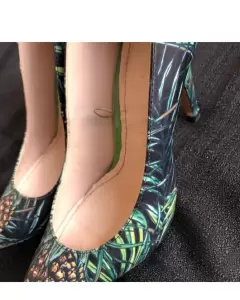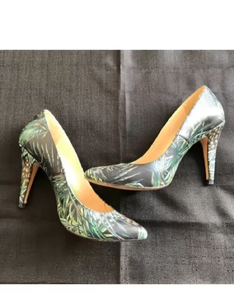 Tacones casuales multicolor. Padrísimos tacones ZARA, color verde, 25.5, con un diseño de estampado tipo tropical, como palmeras con piñas. Superfashion. El tacón es # 10. Son usados pero no mucho, sin embargo con mucho más tiempo de vida para dar, ya que su exterior está en excelente estado.