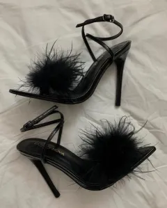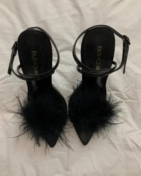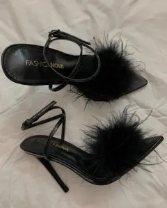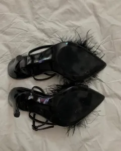 Tacones negros🖤. Tacones negros puestos una sola vez, como nuevos, con pompones en la punta, sin plataforma y forma punteada en los dedos, con pulsera ajustable.