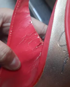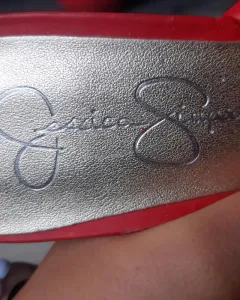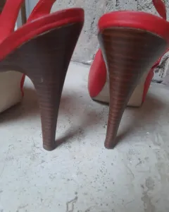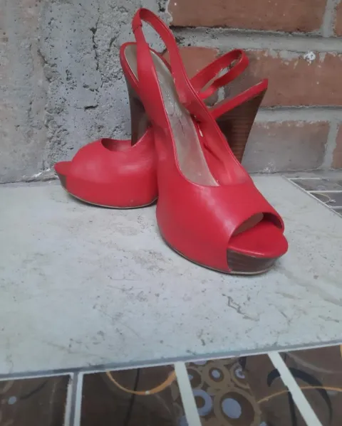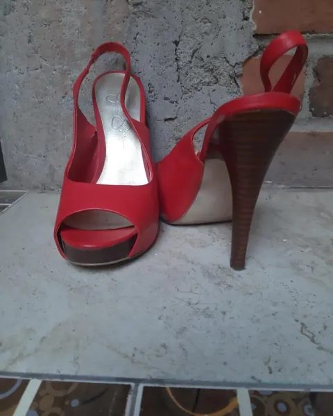 Hermosos tacones rojos con abertura en la parte de enfrente, detalle en la correa, resote en la parte de la correa, corte tipo piel, buena marca y casi nuevos, solo ese detalle por tenerlos guardados