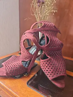 Zapatillas tobilleras, ajustable s broches alarga pantorrilla. Color vino, tacón delgado 8 cm, cómodo, destalonados. Día y noche con estilo excesivo
