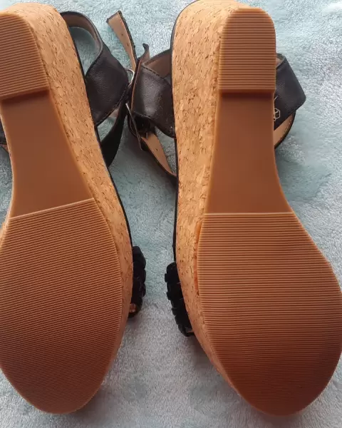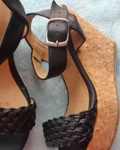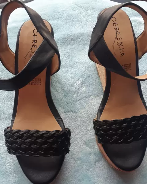 Wedge negros, con hebilla y cintas tejidas, la plataforma mide 8 cm