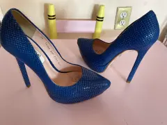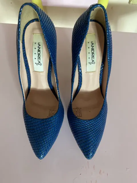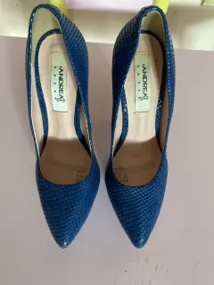 Zapatilla. Zapatilla Andrea color azul de textura como piel de víbora del número 3 y altura de tacón 14 cm