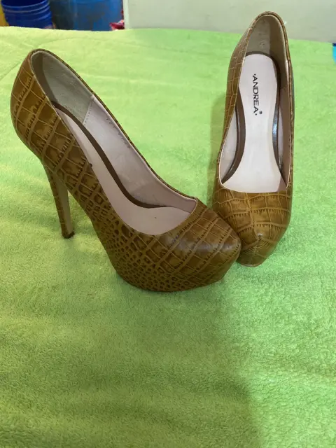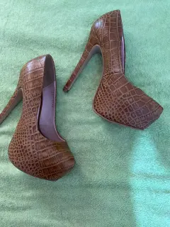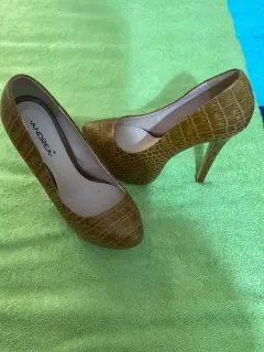Zapatilla. Zapatilla marca Andrea de color café con decorado de tigre, la altura de tacón es de 14 cm