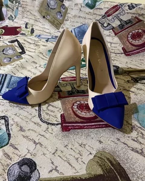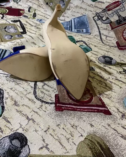 Zapatilla Stiletto color beige punta color azul rey, solo se usó 1 vez