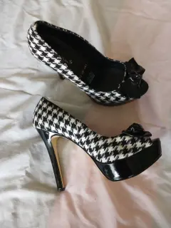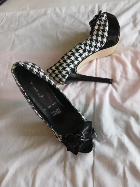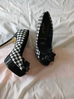 Zapatillas punto Roma, blanco con negro, número 6, altura de tacón 12 con plataforma, tela y charol, nuevos son etiqueta!