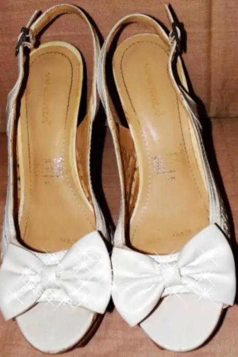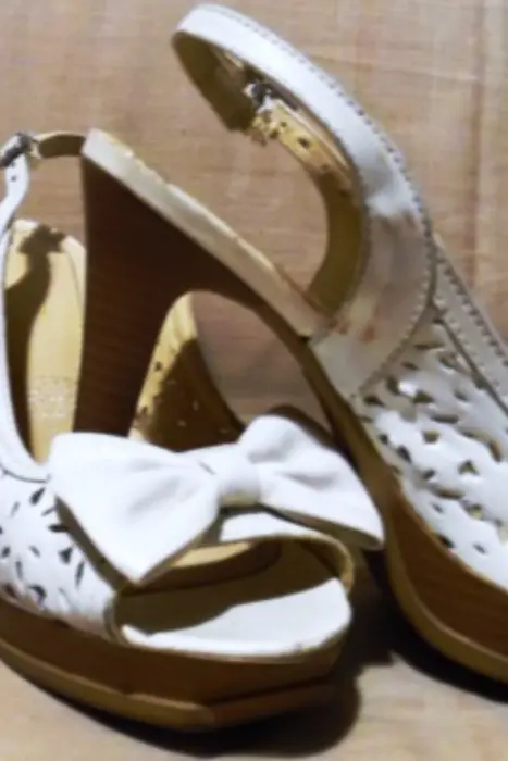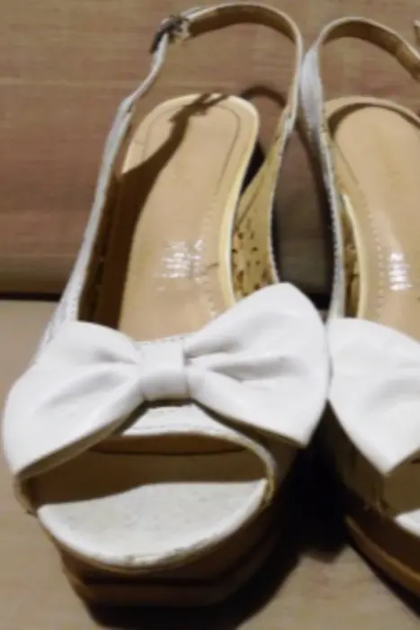 Sandalia Andrea blanca.Con un moño en el frente que le da un toque muy coquette.Con plataforma de 2 cms. y tacón de 9 cms.Trae en la parte posterior una correa ajustable al tobillo.Muy cómodas.
