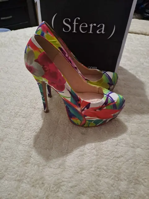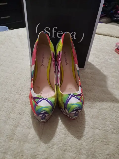 Hermosa Zapatilla floreada para Dama, marca Andrea, tacón 15, con plataforma delantera, número 5, en buenas condiciones