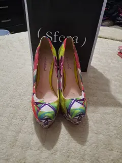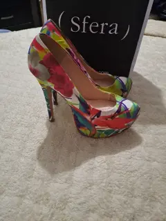 Zapatilla floreda para Dama. Hermosa Zapatilla floreada para Dama, marca Andrea, tacón 15, con plataforma delantera, número 5, en buenas condiciones