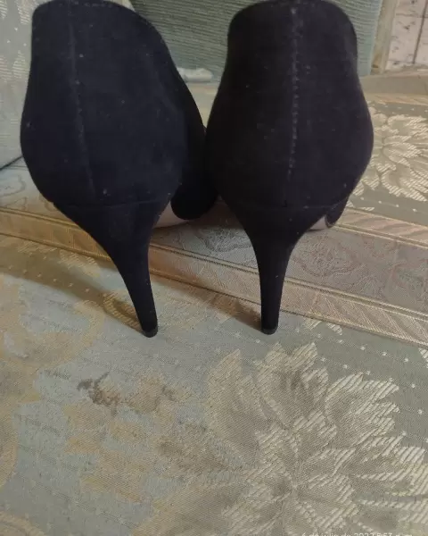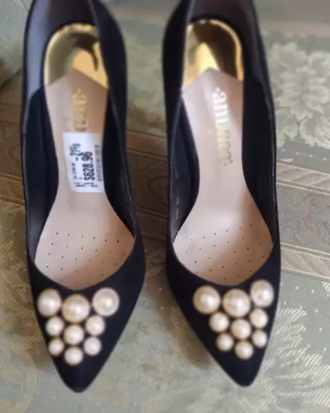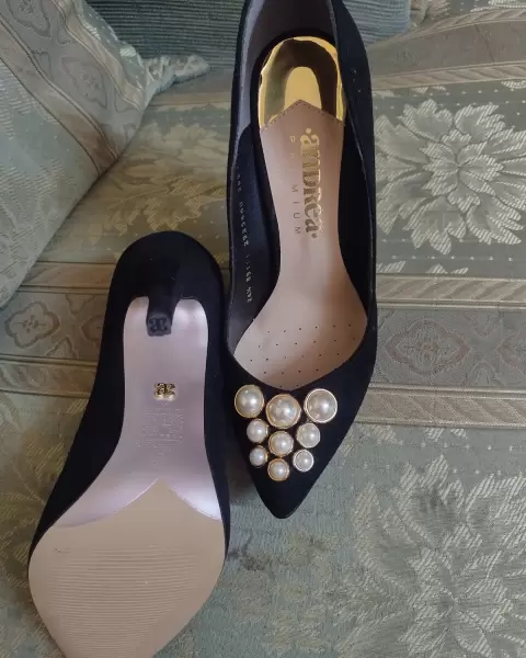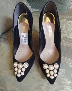 Zapatilla negra. con perlas sintética. Bonita zapatilla picuda con accesorios de perla sintética, tacón delgado número 11