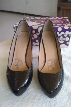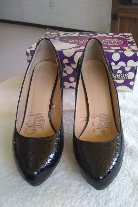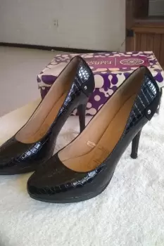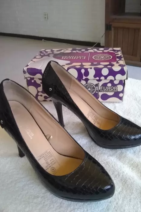 Bonita Zapatilla de la marca Furor Footwear en charol y gamuza, es número 25, viene amplia, queda perfectamente a personas del número 26, tacón del número 10, plataforma al frente, corte sintético, forro sintético, suela sintética, entrego en caja original, poco uso, buenas condiciones, precio regular en tienda es de $ 490.00 vendo en$ 270.00