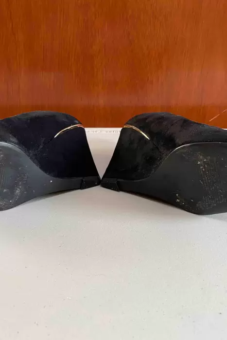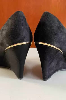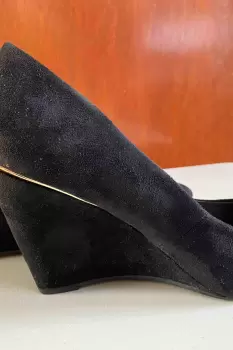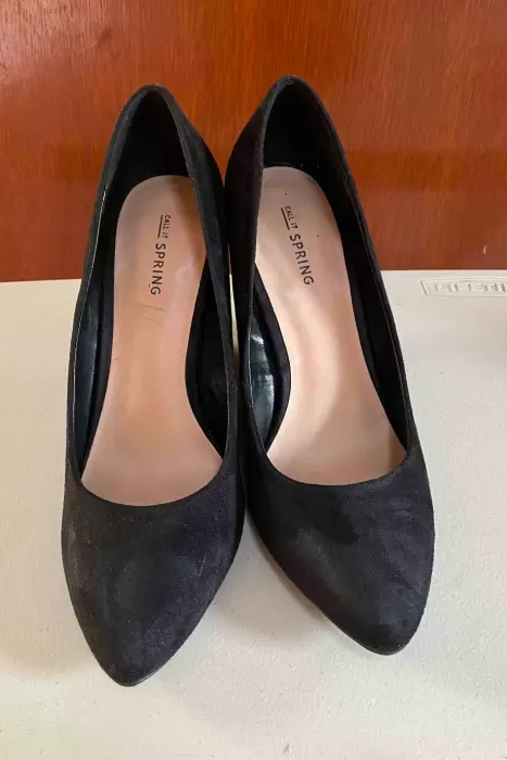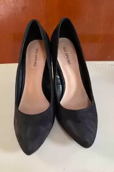Zapatilla Pump Ante Negro. Spring Zapatillas Negro AnteZapatos super cómodos y chuleadosMarca Call it SpringColor Negro con ribete doradoTalla 5.5 Usa 8.5Tacón altura 8.5 cmPlataforma altura 2 cmComodidad 10 de 10