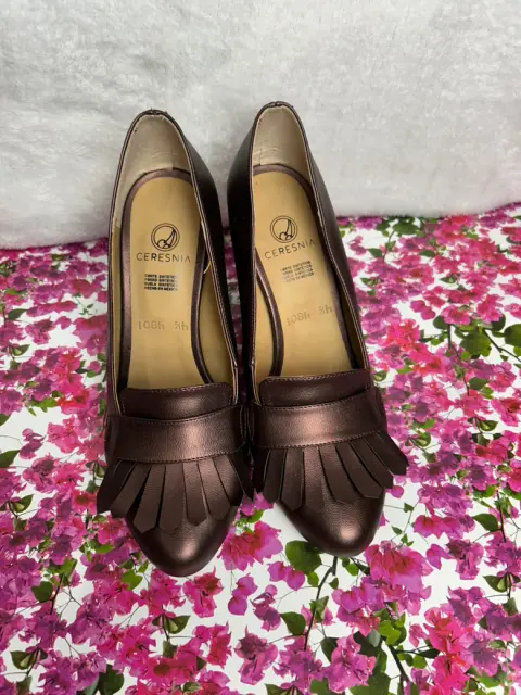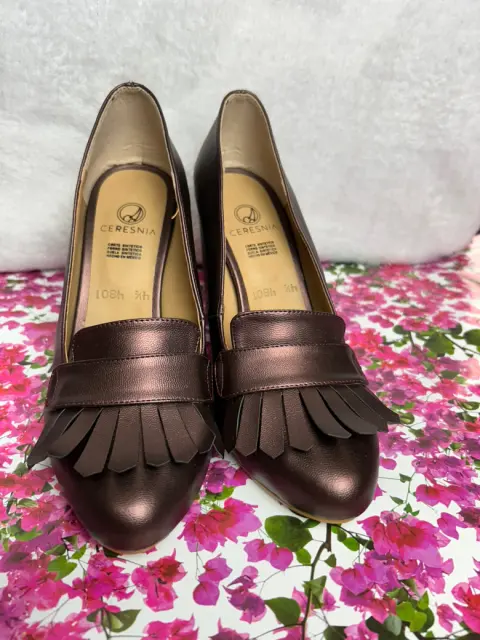 Zapatilla semi oval con flequillos. Zapatilla con flequillos, color vino tornasol con tacón grueso semi oval, tacón 9 cm. Envío sábados tal vez antes. No hago intercambios ni apartados.